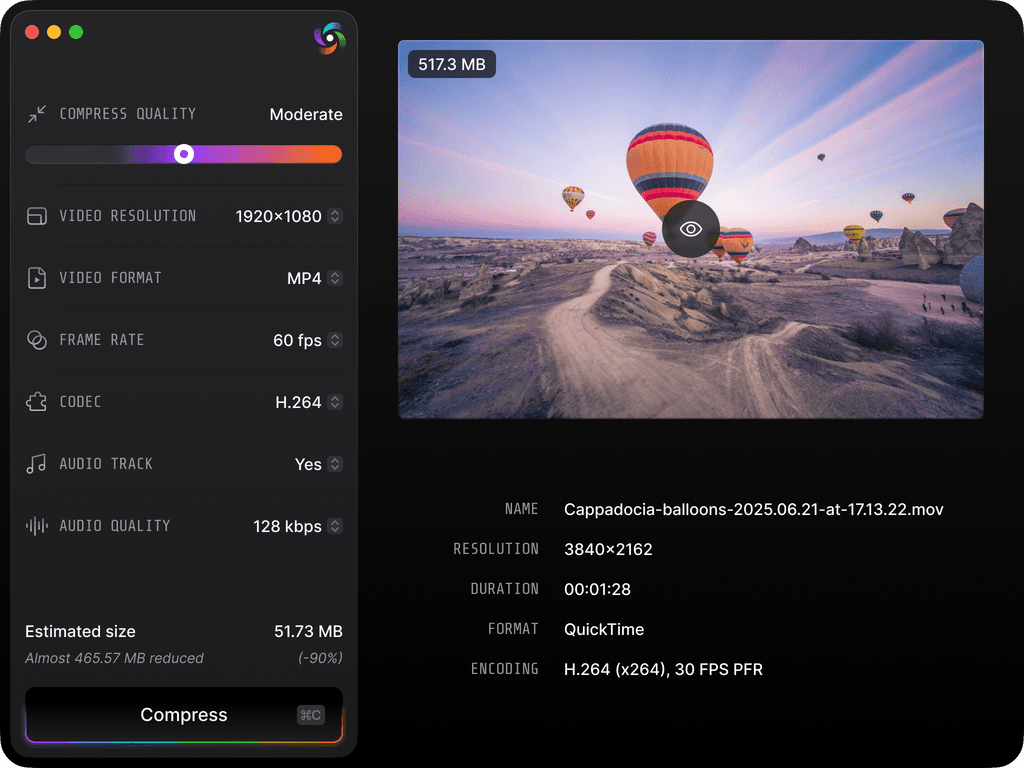 Your Settings, Your Rules. Tweak resolution, bitrate and frame rate to get the perfect balance of size and quality.